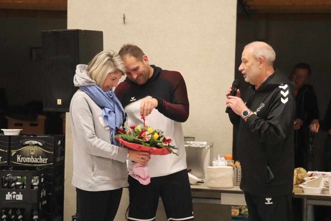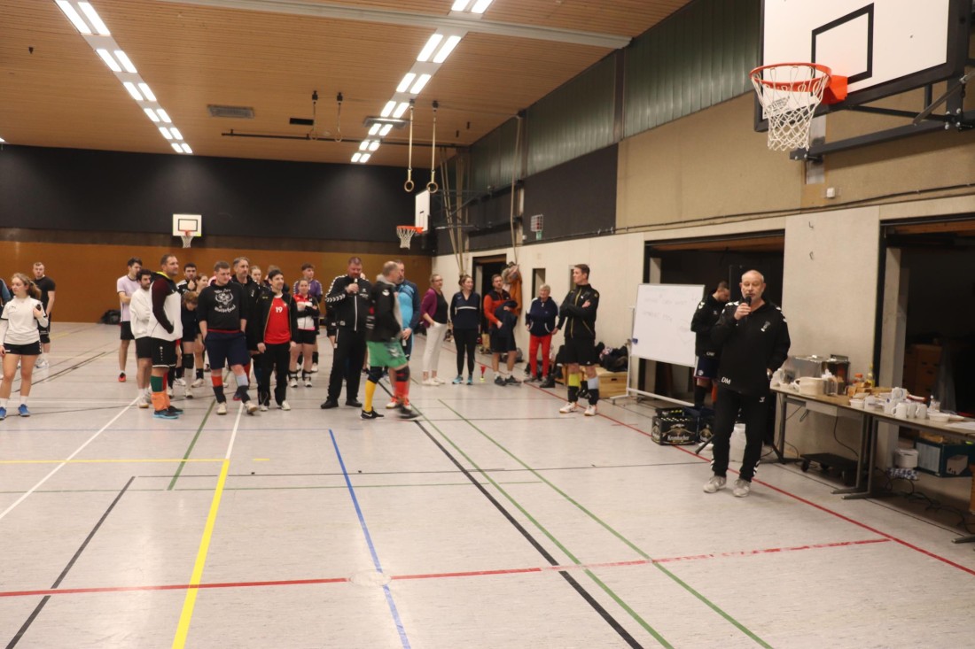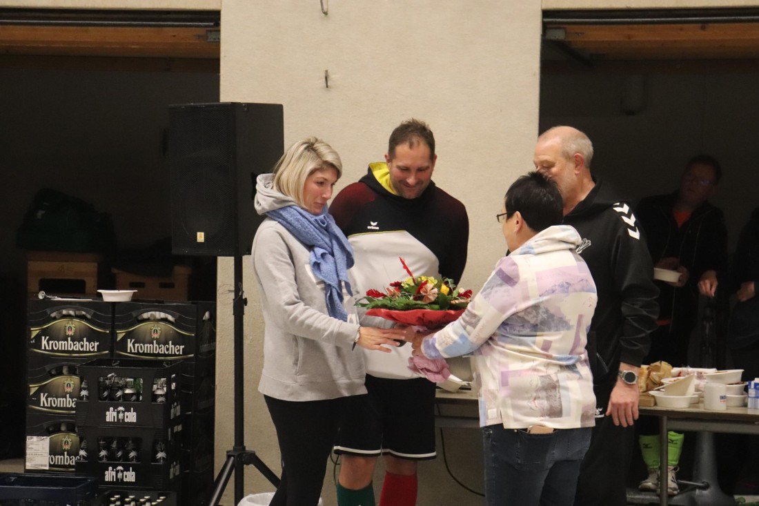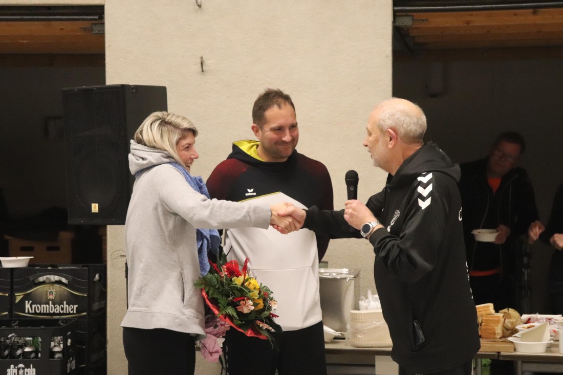 Zu Beginn des Turniers nahm der 1. Vorsitzende Dirk Marquardt zunächst zwei Ehrungen vor. Kim Güldenhaupt wurde nachträglich für ihre 5jährige Mitgliedschaft geehrt. Und Ann-Christin und Matthias "Matze" Embers (geb. Vollmer) bekamen zu ihrer Hochzeit Ende November noch den traditionellen Indiaca-Blumenstrauß überreicht.