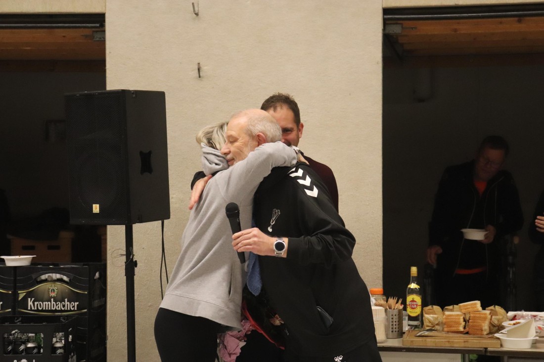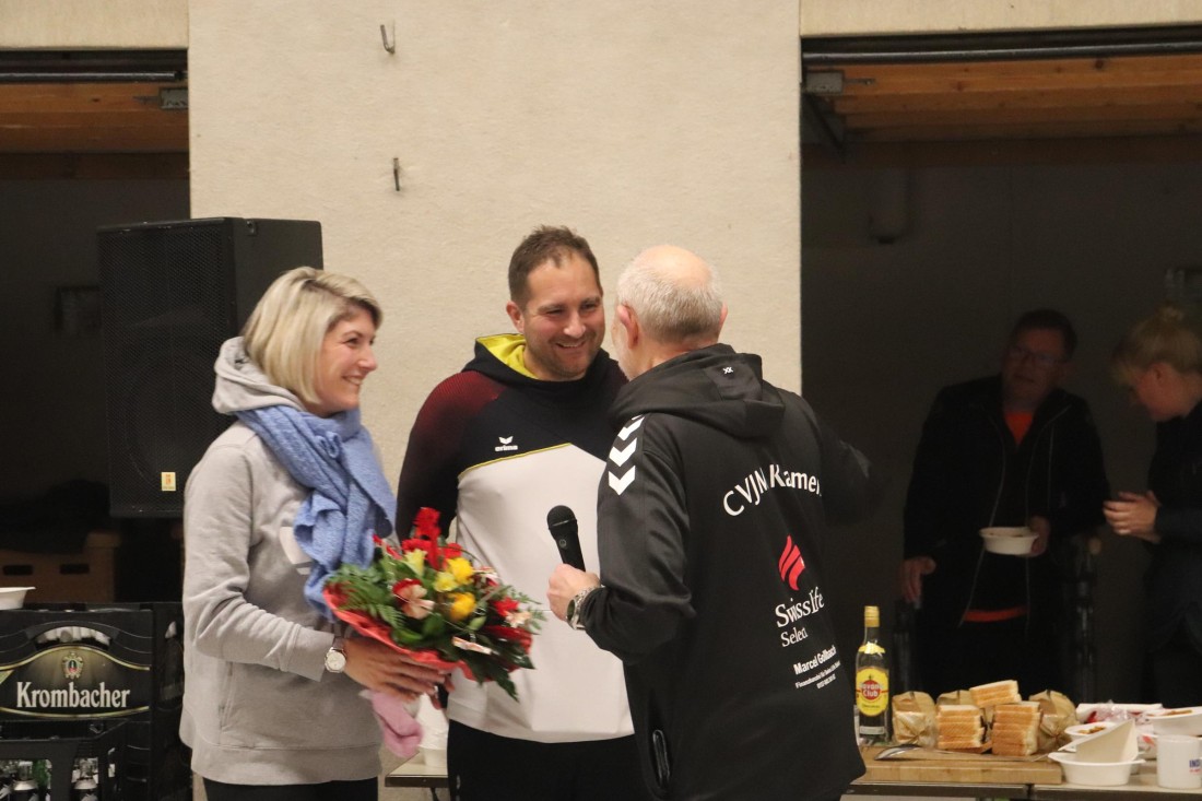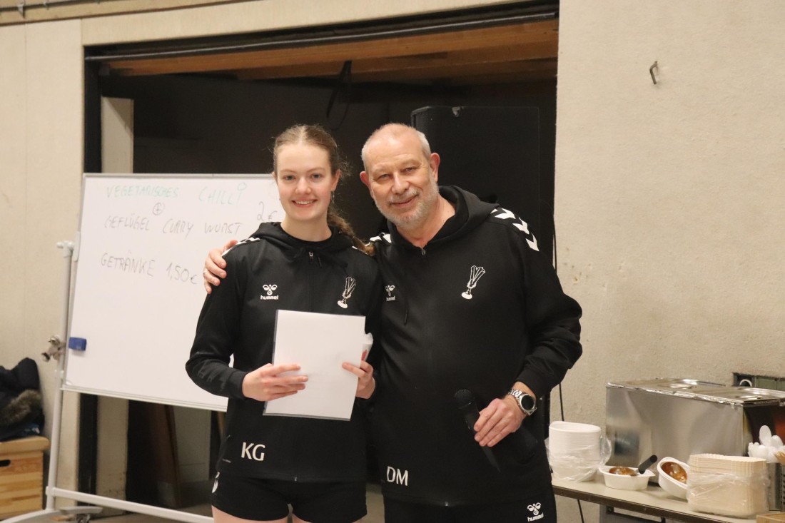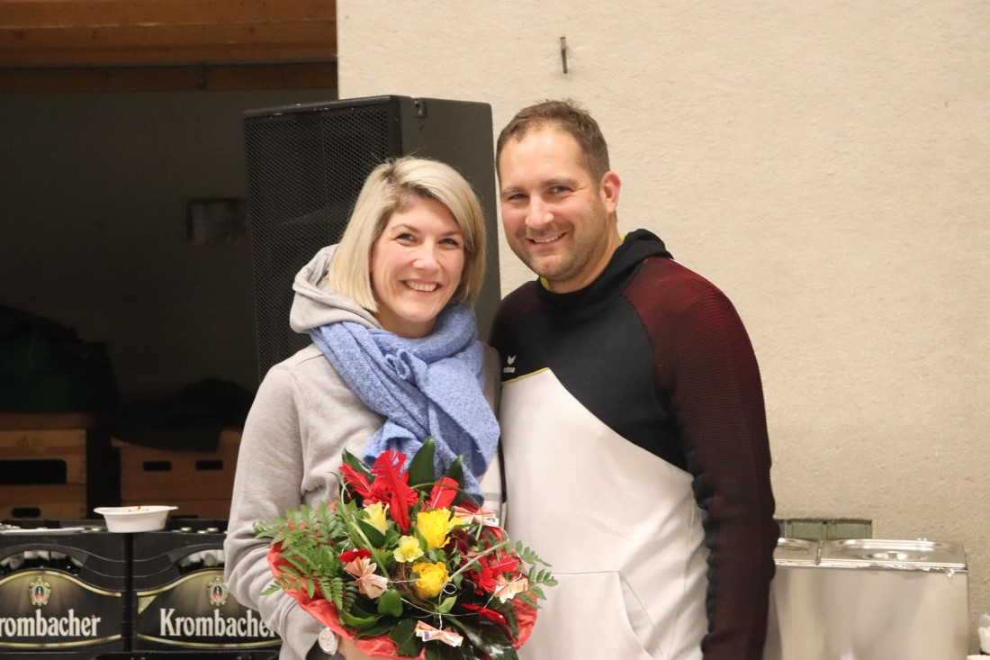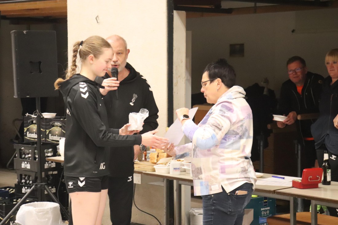 Zu Beginn des Turniers nahm der 1. Vorsitzende Dirk Marquardt zunächst zwei Ehrungen vor. Kim Güldenhaupt wurde nachträglich für ihre 5jährige Mitgliedschaft geehrt. Und Ann-Christin und Matthias "Matze" Embers (geb. Vollmer) bekamen zu ihrer Hochzeit Ende November noch den traditionellen Indiaca-Blumenstrauß überreicht.