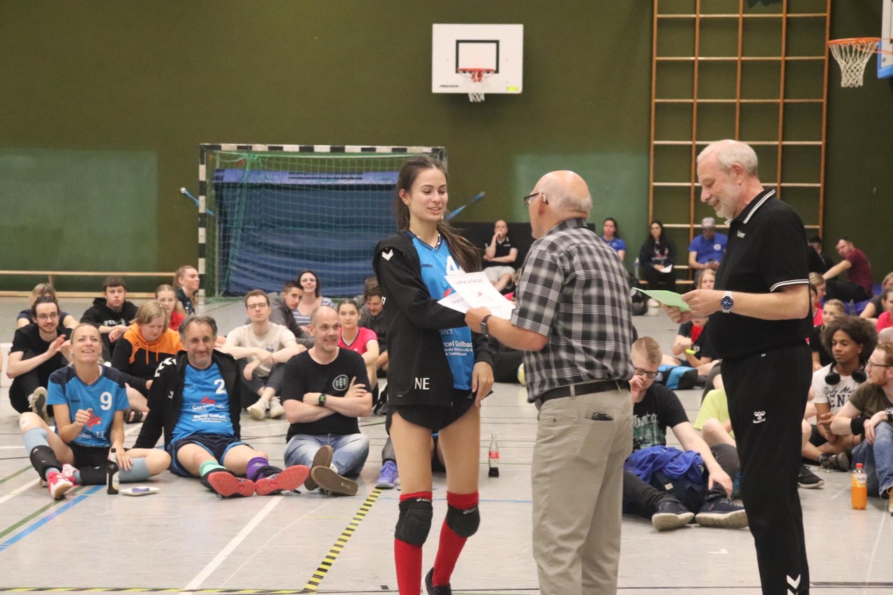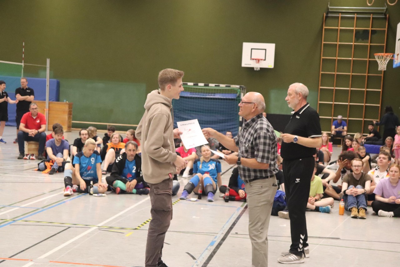 Unterdessen liefen in den Hallen die Turniere der Damen, Herren und der Schüler 11-14. Bei den 7 Damenmannschaften stellte der Nationalkader für die WM 2025 alleine 4 Mannschaften, die dann auch die ersten vier Plätze belegten. Bei den Herren umfasste das Feld 12 Mannschaften. Es siegte CVJM Sylbach/Pivitsheide vor TSV Enzweihingen und TSG Blankenloch. Bei den Schülern blieb der Pokal in Kamen. Kamen 1 siegte vor CVJM Sylbach/Pivitsheide und CVJM Kamen 2. Die Siegerehrung wurde vom stellv. Bürgermeister Manfred Wiedemann und dem Vorsitzenden des CVJM Dirk Marquardt vorgenommen.