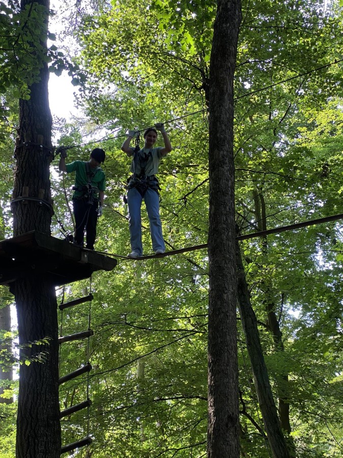 Los ging es um 10:15 Uhr vom Gemeindehaus. Bei Tree-to-Tree angekommen, gab es vor dem Anlegen des Klettergeschirrs eine kleine Einführung in die Sicherheitsvorschriften. Dann konnte es losgehen. Von 12 - 15:30 Uhr wurden bei super Wetter diverse Parcours in unterschiedlichen Schwierigkeitsgraden gemeistert, je nach Gefallen und Mut. Unsere Jugendlichen hatten dabei jede Menge Spaß.